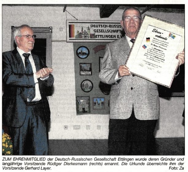 Waldbronn (Za). Ihren 20. Geburtstag feierte die Deutsch-Russische Gesellschaft (DRG) Ettlingen bei einem Festakt in der Buhlschen Mühle. Dabei wurde ihr Gründer und langjähriger Vorsitzender, Rüdiger Dierkesmann, zum Ehrenmitglied ernannt. Umrrahmt wurde der festliche Abend durch das Saxophon-Duo Isa Amelie Peterson und Valentin Braun von der Musikschule Ettlingen Den Schlusspunkt setzte das Kostümtheater „Katjuscha“ aus der russischen Partnerstadt Gatschina. Vorsitzender Gerhard Laier erinnerte in seinen Grußworten daran, dass Rüdiger Dierkesmann zur Zeit der Wende vor 20 Jahren die Deutsch-Russische Gesellschaft ins Leben gerufen hat. Auf diesem Fundament wurde dann die Partnerschaft mit Gatschina aufgebaut, die Urkunde unterzeichnete 1992 Oberbürgermeister Josef Offele. Die Geschichte der Deutsch-Russischen Gesellschaft in Ettlingen stellte Wolfgang Lorch bei seinem Rückblick in einen breiten geschichtlichen Kontext und zeigte Verbindungen zwischen der Region Karlsruhe und dem russischen Zarenhof auf, wobei in diesen Bezügen immer wieder der Name Gatschina auftauchte.